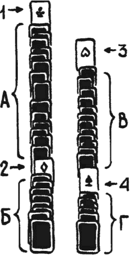 А другие карты, китайские? Здесь сомнения исчезают. Изготовленные из бумаги гораздо более высокого качества, они обладают размерами, вполне приемлемыми для комфортного удержания их в руках. Более того – нанесенные на них символические рисунки (чаще всего изображавшие людей) снабжались особы ми пометками, которые определяли принадлежность данной карты к той или иной определенной колоде. Много позже заезжие европейцы скопируют эти изображения и доставят их к себе домой в качестве образцов китайской экзотики. Затем другие европейцы механически, без вникания в изобразительный смысл, перенесут их на свои карты, а еще через много лет третьи европейцы трансформируют их в королей, дам и валетов. Что до цифровых обозначений, то они красовались на другой стороне карт – в виде кружочков. Если, к примеру, восемь кружочков, то – восьмерка. Кстати, нередкими были случаи, когда такие карты использовались в совершенно другой игре – в домино.