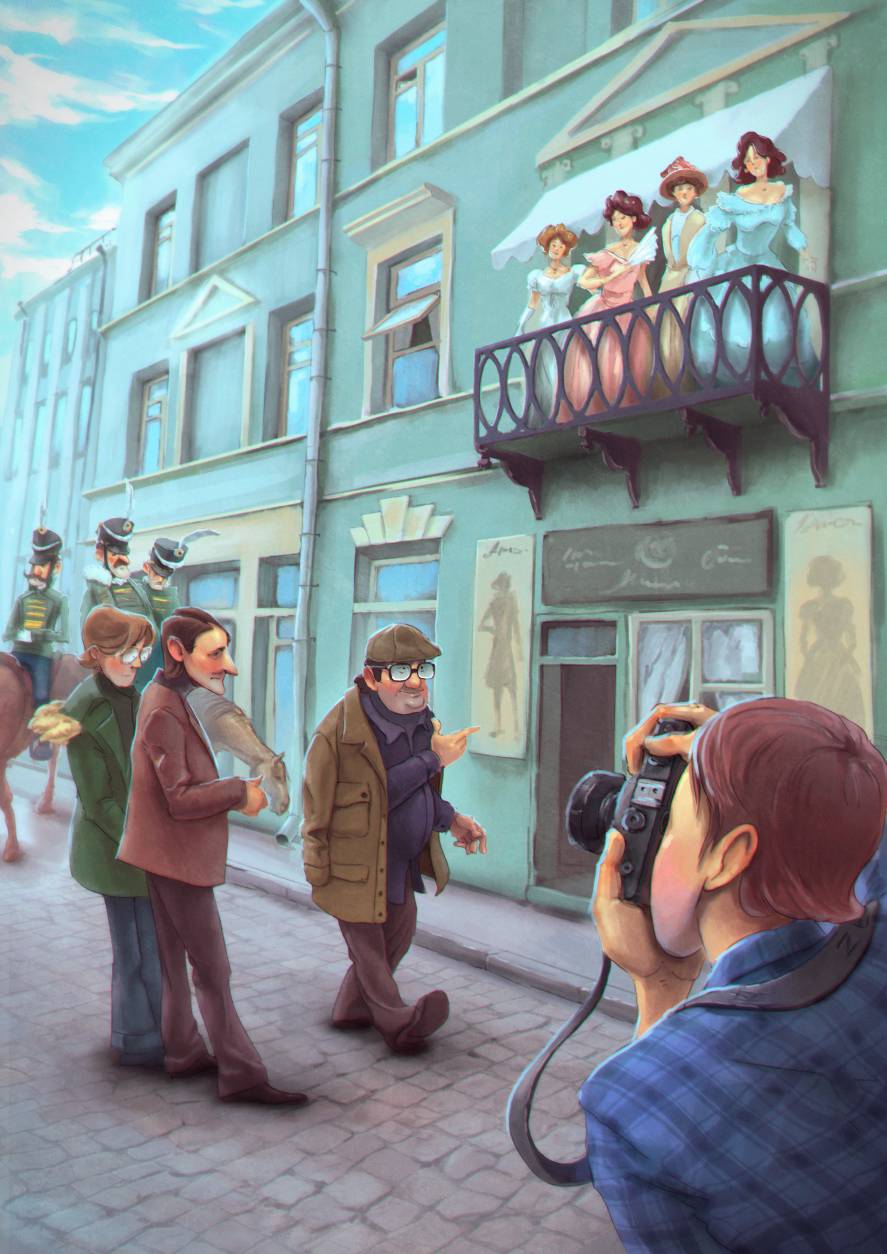 Лёша уселся на подоконник поудобнее и стал наблюдать за приготовлениями к съёмкам. Подоконник окна третьего этажа оказался внезапно царской ложей с великолепным обзором на развернувшееся внизу представление. Улица преображалась. Где-то что-то приколачивали, где- то что-то красили. Их дом обрастал атрибутикой старых времён. Внизу на балконе, у соседей со второго этажа, начали появляться барышни в пышных юбках и шляпках. Прилипнув к стеклу, Лёша вглядывался в лица. Ну а вдруг какого-нибудь известного актёра увидит? Вот так повезёт! И вдруг… Мужчина в плаще убрал громкоговоритель от лица, поднял голову, и Лёша не поверил своим глазам! Это же Эльдар Рязанов! Не может быть! Лёша обожал все его фильмы. «Ирония Судьбы», «Служебный роман», «Гараж»… А теперь он снимает какое-то новое кино прямо у Лёшиного дома! Такой шанс точно нельзя было упустить.