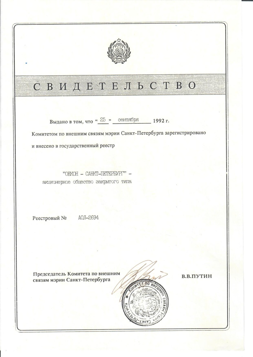 Свидетельство о регистрации компании «ОЕКОН — СПб».