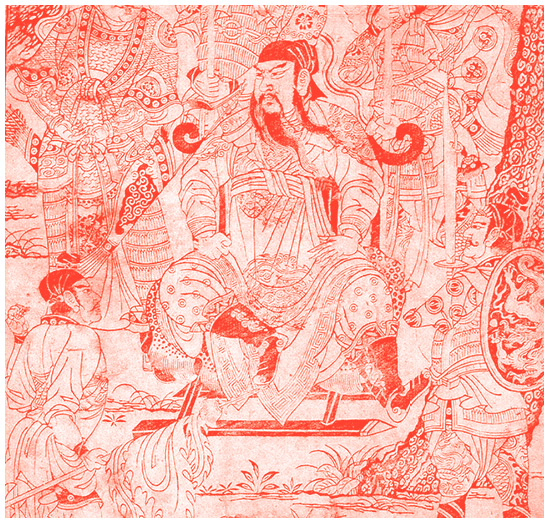 Бог-воин Гуань Юй, обожествленный герой романа «Троецарствие». Ксилография, XIII или XIV век.