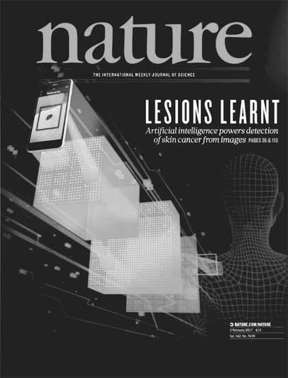 Рис. 1.5. Обложка журнала Nature от 2 февраля 2017 года. Взгляд художника на диагностирование кожных заболеваний при помощи глубокого обучения