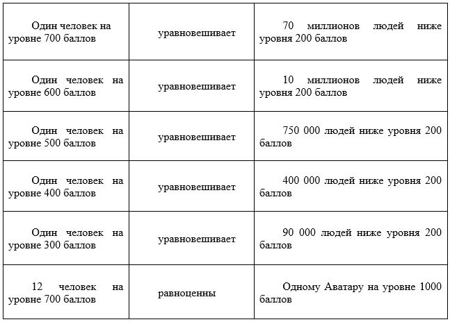 Более того, мы полагаем, что этот феномен может быть использован для определения уровней человеческого сознания благодаря созданию произвольной логарифмической шкалы, указывающей на относительную силу уровней сознания во всех сферах человеческой жизни. Детальное исследование привело к появлению градуированной шкалы сознания, в которой ряд целых чисел от единицы до тысячи указывает на степень выраженности всех возможных уровней человеческого сознания.