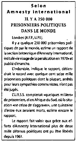 — Тс. «Клермон-Феран. Тимчасова керівна рада філологічно-гуманітарного факультету Клермон-Феранського університету оприлюднила комюніке, в якому заявила, лапки відкриваються, що з обуренням дізналася про жорстокість поліції, жертвою якої в Парижі недавно став месьє П’єр Пешу, факультетський викладач-асистент історії. Лапки закриваються. Комюніке уточнює, лапки відкриваються, що 28 травня о 22-й годині п'ятдесятип’ятирічний месьє Пешу, що повертався додому після цілого дня праці в бібліотеці, йшов по бульвару Сен-Мішель, і раптом на нього несподівано напала поліція, його побили кийками, повалили на землю й забрали спершу до комісаріату, звідки перевели до слідчого ізолятора в Божоні. Вранці його перевезли до Божонської лікарні, бо з’ясувалося, що він не може ходити, а через тиждень відвезли додому в Клермон-Феран, месьє Пешу страждає від потрійного переламу колінної чашечки і ран, які прирікають його на кілька тижнів нерухомості. Лапки закриваються. Тимчасова керівна рада факультету призначила делегацію, яка проситиме про зустріч із ректором Клермон-Феранського університету, щоб висловити обурення факультету».