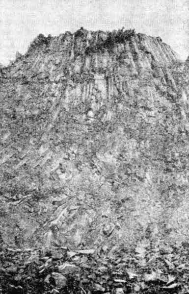 Фото 39. Глубокий врез в дацитовый массив. В ранее застывшие дациты произошло повторное внедрение (на снимке — веерообразный выступ внизу).