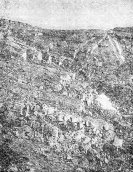 Фото 32. Массив дацитов в верховье реки Сары-Кыллах. По склону и гребню массива видны пирамидальные выступы.