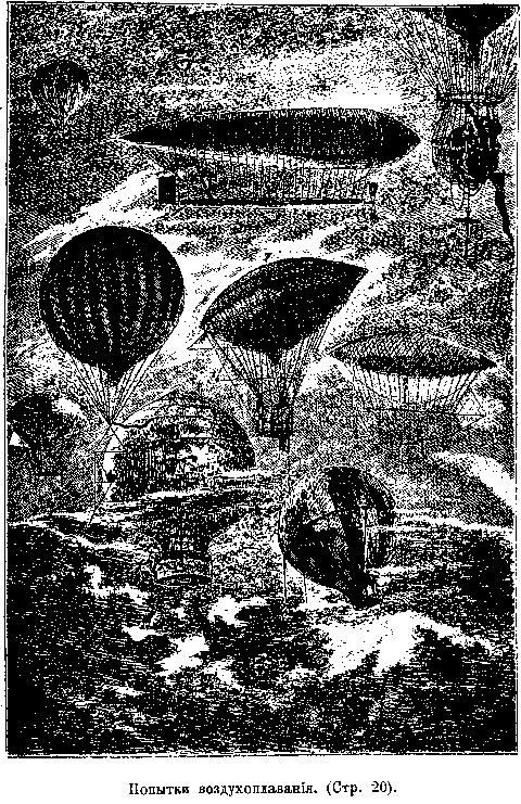 Со времени опытовъ, сдѣланныхъ въ послѣдней четверти нашего столѣтія, вопросъ объ управленіи воздушными шарами подвинулся на нѣсколько шаговъ впередъ. Лодочки съ пропульсирующими винтами, которыя были въ 1852 году привязываемы къ удлиненнымъ аэростатамъ Анри Жиффара, въ 1872 году къ аэростатамъ Дюпюи де-Лома, въ 1883 году къ шарамъ братьевъ Тиссандье и, наконецъ, въ 1884 году къ аппаратамъ капитановъ Кребса и Ренара, дали извѣстные результаты, съ которыми нельзя не считаться. Но если всѣ эти аппараты и могли маневрировать въ болѣе тяжелой, чѣмъ они сами, серединѣ, то это происходило лишь благодаря особенно счастливому стеченію обстоятельствъ. Правда, этими шарами управляли очень удачно, но гдѣ? Въ огромной залѣ съ закрытыми окнами. Также удачны были опыты и на открытомъ воздухѣ во время безвѣтрія. Очень сносно дѣйствовали винты и при небольшомъ вѣтрѣ: шары маневрировали противъ вѣтра, побѣждая его сопротивленіе. Но въ сущности практическаго результата все же никто не добился. Противъ вѣтра, способнаго вертѣть вѣтряныя мельницы, эти шары останавливались какъ вкопанные; при вѣтрѣ чуть немного посильнѣе они уже пятились назадъ; болѣе сильнымъ вѣтрамъ ихъ не подвергали, но по всей вѣроятности сильный вихрь подхватилъ бы такой аэростатъ какъ перышко, а ураганъ разметалъ бы его въ куски, такъ что отъ всей хитрой затѣи ничего бы не осталось.