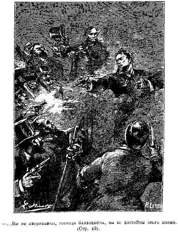 Въ большой, уже упомянутой нами, залѣ засѣдали съ шляпами на головахъ человѣкъ сто баллонистовъ, подъ предсѣдательствомъ президента, которому помогали секретарь и казначей. Тутъ не было инженеровъ, спеціалистовъ, а были по большей части одни любители всего относящагося къ воздухоплаванію, но зато любители страстные, горячіе сторонники воздушныхъ шаровъ и рьяные противники аппаратовъ, «тяжелѣе воздуха», какъ-то: летающихъ машинъ, воздушныхъ кораблей и проч. Эти господа старались изобрѣсти способъ управлять шарами, а до тѣхъ поръ президенту общества очень трудно было управлять ими самими во время бурныхъ засѣданій.