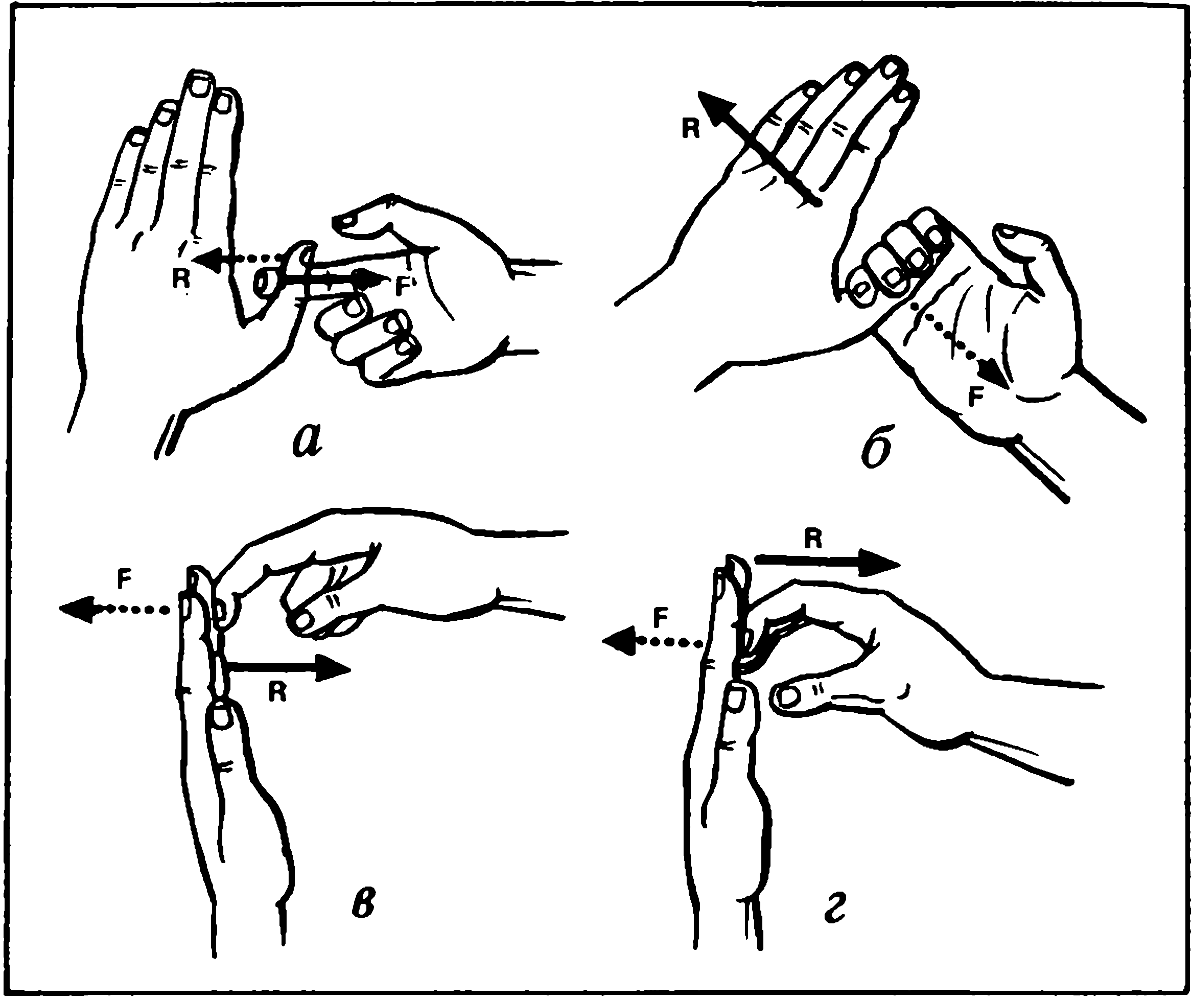 Более полное комплексное нагружение мышц, «управляющих» движением кисти, показано на рис. 5в (исходное положение) и 5 г. Обхватив пальцами верхней руки согнутую в кулак кисть другой руки, вращать эту кисть. При этом руками создают нажим во встречном направлении (R).