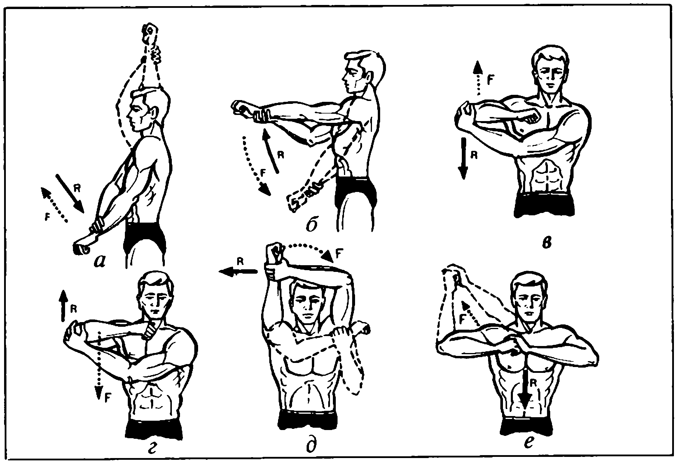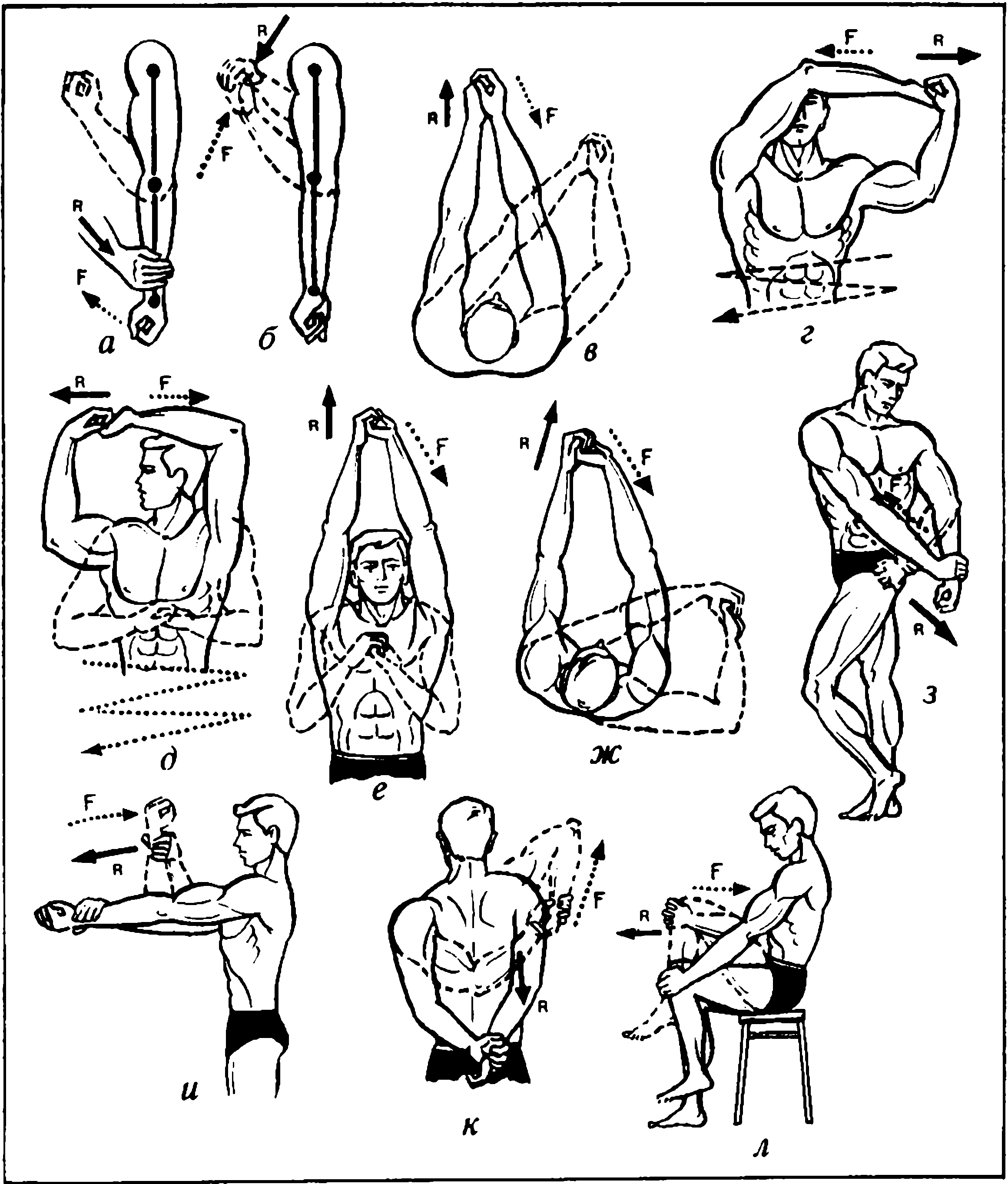 Большими возможностями обладают упражнения 6в, г, д, позволяющие увеличить полноту нагружения мышц-сгибателей за счет всевозможных пространственных положений рук. При этом эффективно включаются мышцы плечевого пояса, участвующие во всех перемещениях рук при их подъеме до уровня плеч и выше. Нужно также отметить, что эти упражнения хорошо тренируют суставы, не только укрепляя их, но и развивая высокую суставную подвижность.