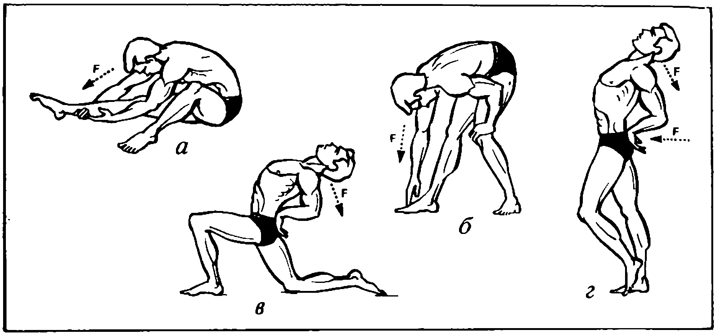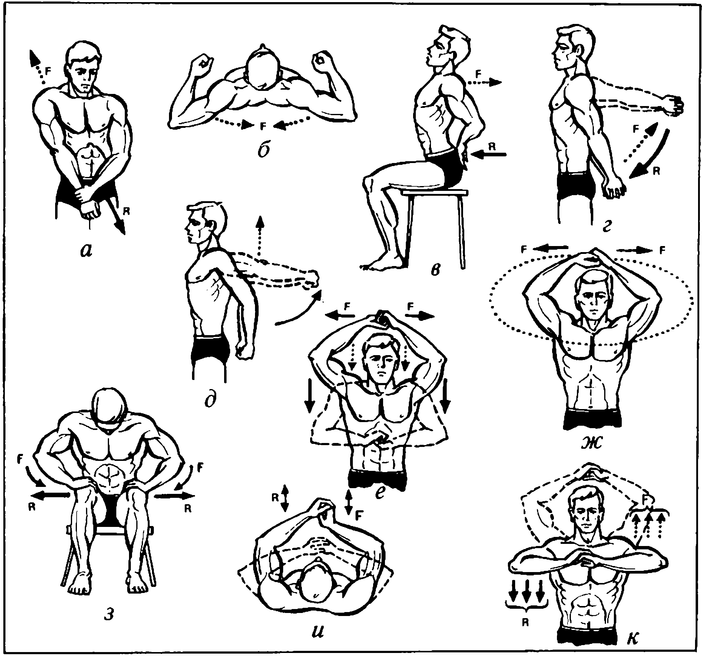 Исходное положение для выполнения упражнения для мышц спины, показанного на рис. 10и, напоминает «старт пловца» (сейчас, правда, пловцы стартуют из другой стойки). В указанном положении напрячь мышцы спины и, сохраняя напряженно-прогнутое состояние, выпрямить ноги. Задержка позы в конечном положении не более 2–3 секунд. Это упражнение можно выполнять сидя (10к); силовой акцент тазом выполнять по стрелке F, как бы стремясь сдвинуть опору назад.