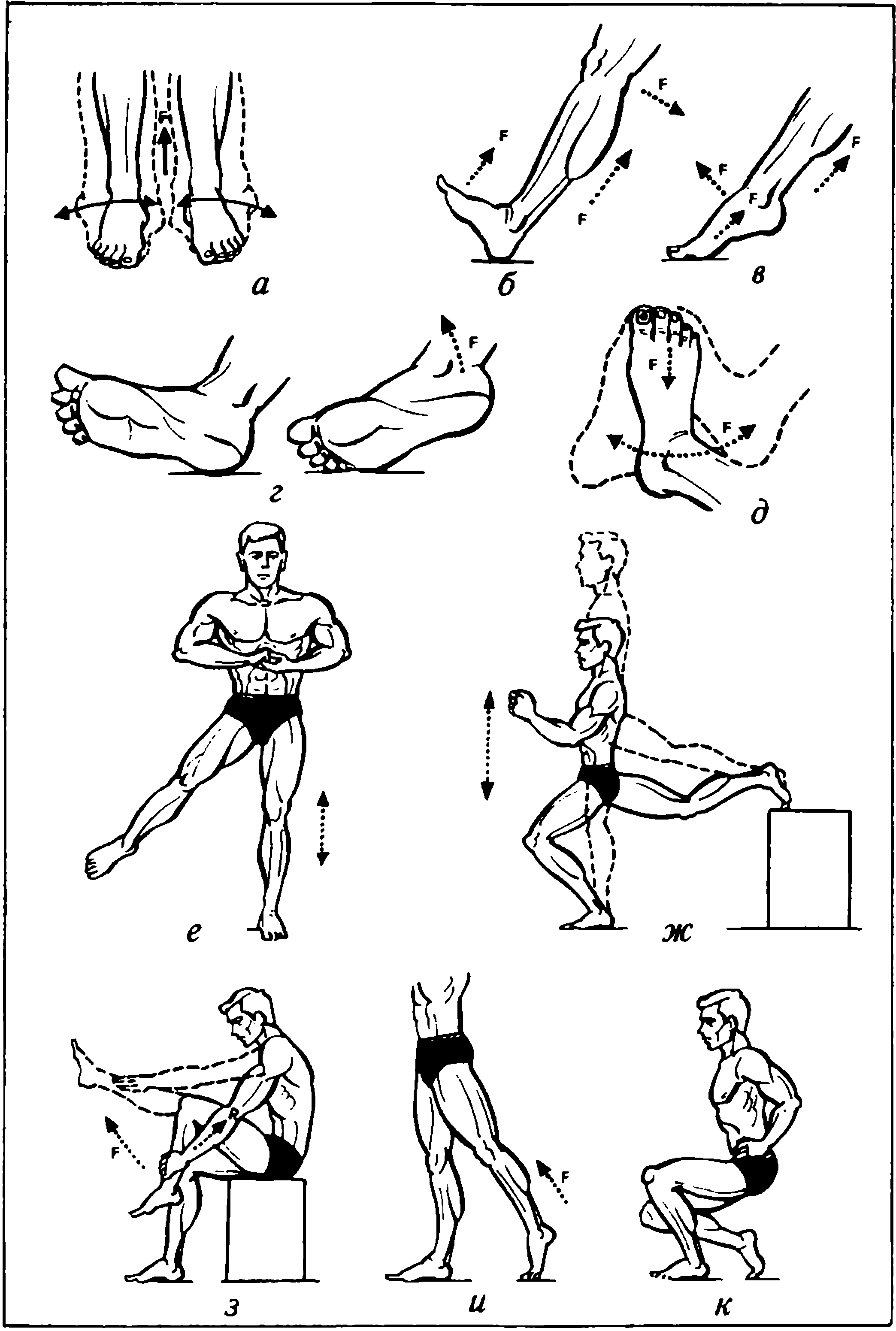 На рис. 11а, б, в, г, д показаны упражнения для проработки подошвенной и тыльной мышечных групп стопы.