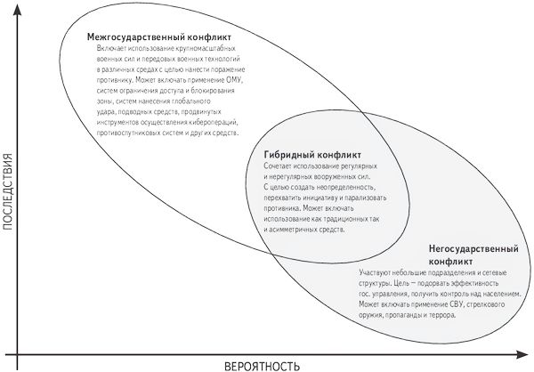Подполковник Ф. Хоффман (резерв Корпуса морской пехоты), вероятно, самый авторитетный американский эксперт по данной проблеме, считает, что в конфликтах такого типа «соединяются смертоносные последствия применения регулярных вооруженных сил с фанатизмом и затяжным характером иррегулярной войны. В ходе конфликтов потенциальные противники (государства, спонсируемые государством группы, негосударственные субъекты) используют доступ к современным военно-техническим возможностям, включая шифрованные системы боевого управления, переносные зенитно-ракетные комплексы и другие современные системы поражения, наряду со способностью вести продолжительные повстанческие действия с использованием засад, самодельных взрывных устройств (СВУ) и акты террора… Гибридные вызовы не ограничиваются лишь негосударственными субъектами. Государства могут замаскировать свои регулярные воинские части под иррегулярные формирования и принять новую тактику»