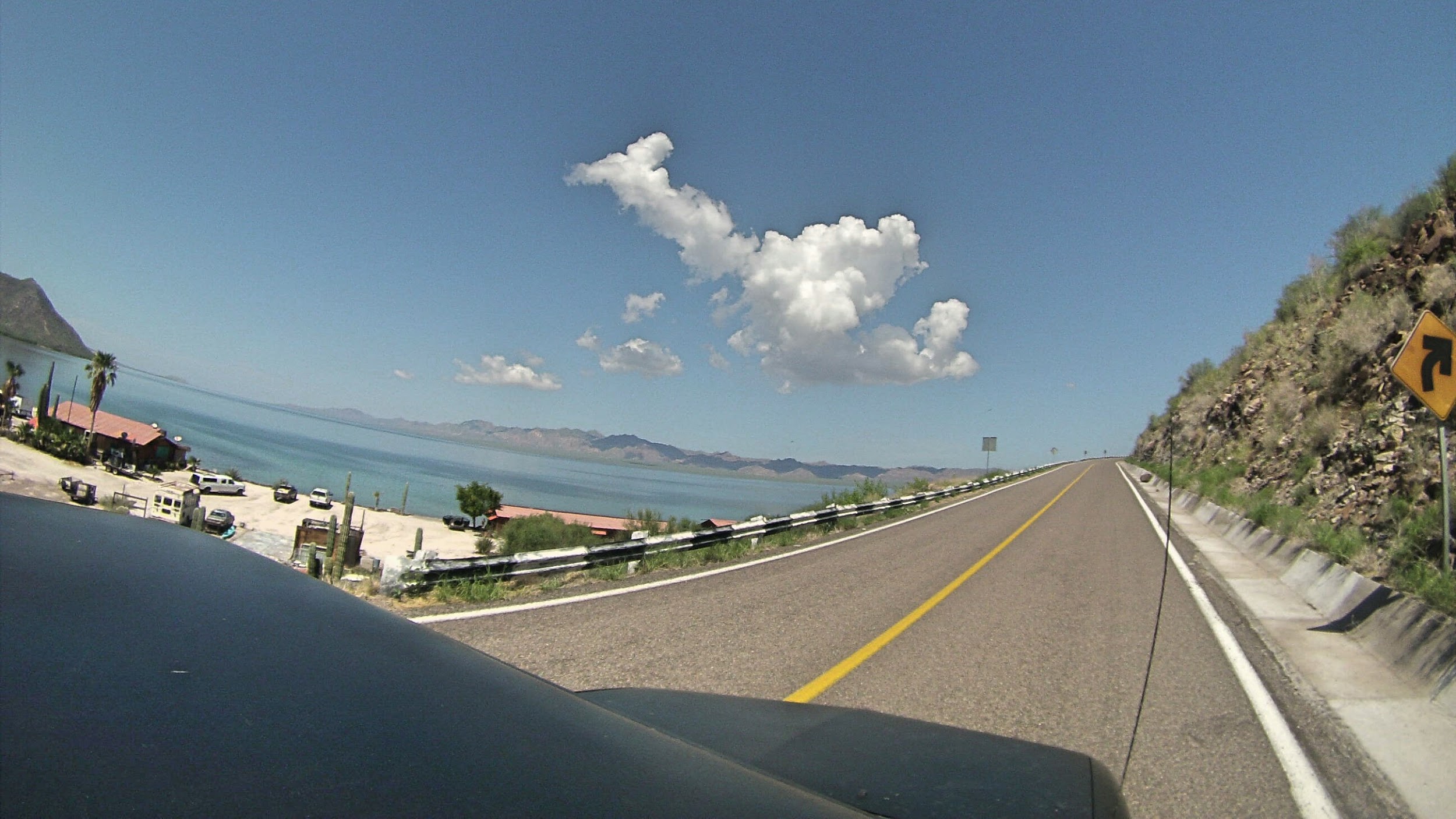 В течение следующих нескольких часов мы продолжали двигаться на юг прочь из пустыни. Настало время задуматься о ночлеге. Наш выбор пал на деревушку в одном из близлежащих заливов, тем более что на карте путь туда был отмечен нормальной дорогой, правда, проходящей через гористую местность. Первую половину пути дорога и вправду была замечательная, совсем недавно уложенный асфальт, разметка и дорожные знаки. Но вот вторая половина оказалась обычной грунтовкой, а несколько последних километров пути представляли собой и вовсе не дорогу, а, скорее, направление для движения. Вообще это довольно типичная ситуация для Мексики, в нормальном состоянии поддерживают только основные шоссе, а со всеми остальными дорогами как повезет.