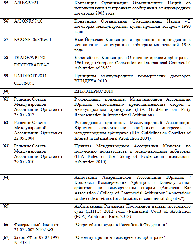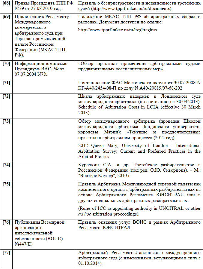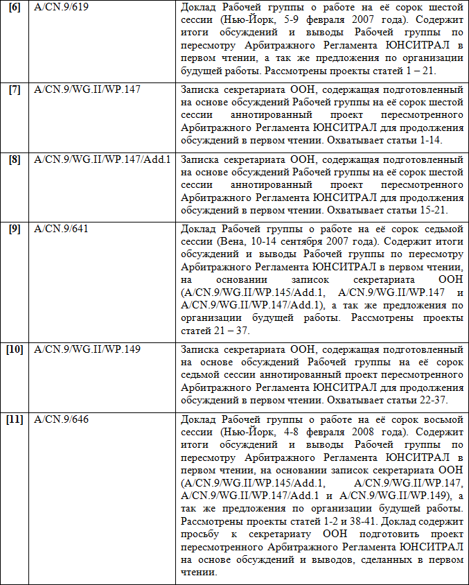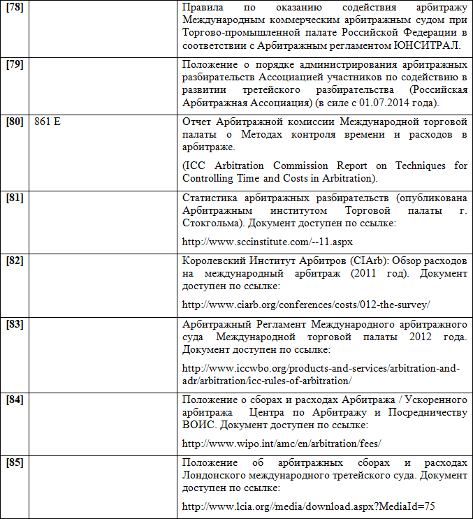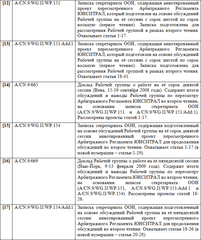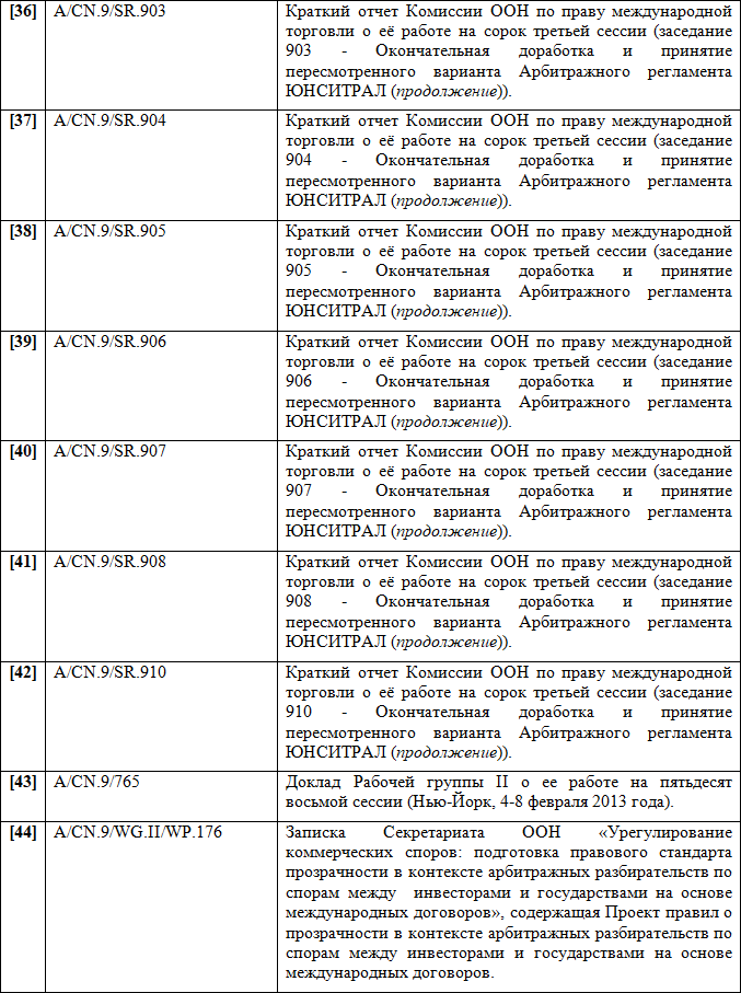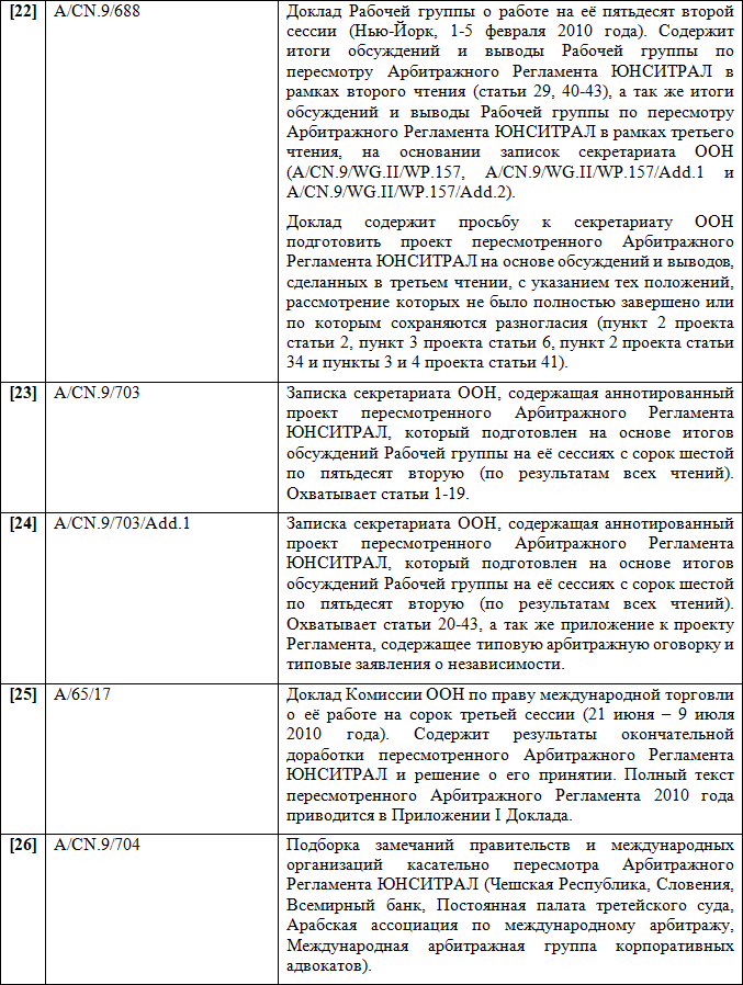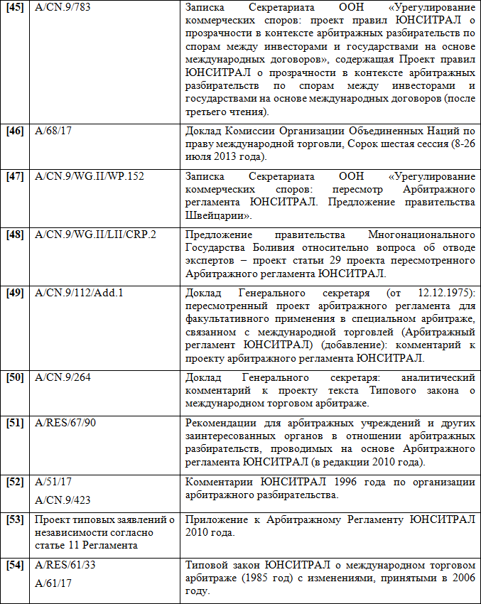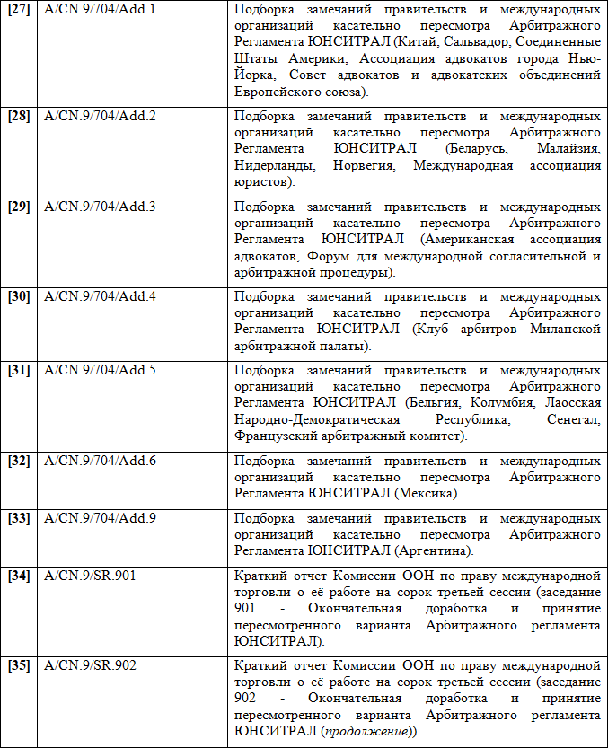 Следует заключить, что Арбитражный Регламент ЮНСИТРАЛ 1976 г. можно по праву считать одним из самых удачных частноправовых инструментов в сфере альтернативного разрешения споров — он применялся в каждом четвертом крупном международном арбитражном процессе.