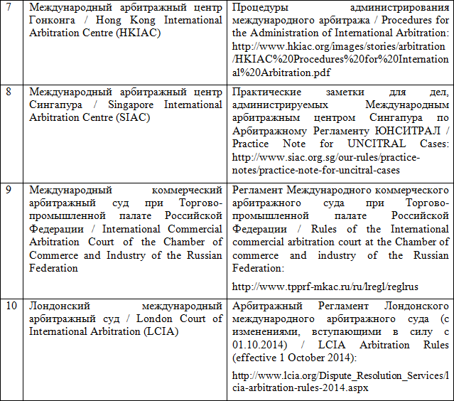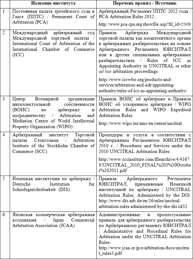 Регламент ЮНСИТРАЛ можно назвать самым популярным Арбитражным Регламентом в мире. Многие арбитражные институты, наряду с собственными правилами, имеют отдельные регламенты, целиком посвященные администрированию процесса по Регламенту ЮНСИТРАЛ (Арбитражный суд Международной торговой палаты [75], Центр Всемирной организации интеллектуальной собственности по арбитражу и посредничеству [76], Постоянная палата третейского суда в Гааге [65], Лондонский международный арбитражный суд [77], Международный коммерческий арбитражный суд при Торгово-промышленной палате Российской Федерации [78] и т. п.).