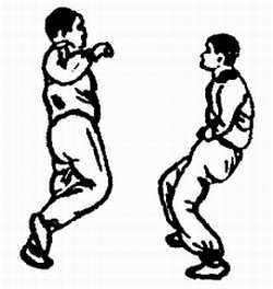 Фиг. 219. Противник собирается идти вперёд. Я делаю удар, используя метод ВСАДНИК ВСКАКИВАЕТ НА ЛОШАДЬ или метод удар в голову. Противник, избегая удара, пригибается. Моя нога проходит над его головой.