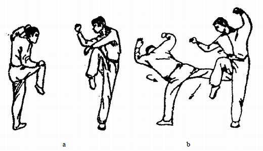 Фиг. 201 а, b. Продолжая движение, я внезапно меняю тактику и выполняю боковой удар ЛОШАДЬ БЬЁТ КОПЫТОМ по опорной ноге противника.