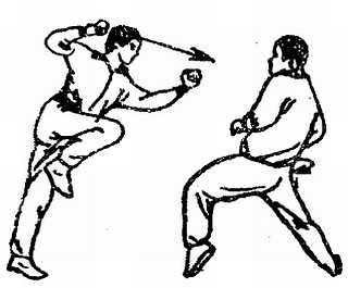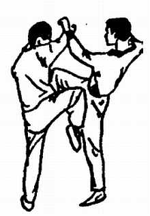 Фиг. 212. Противники стоят лицом друг к другу. Мой противник начинает выполнять короткий фронтальный удар левой (правой) ногой.
