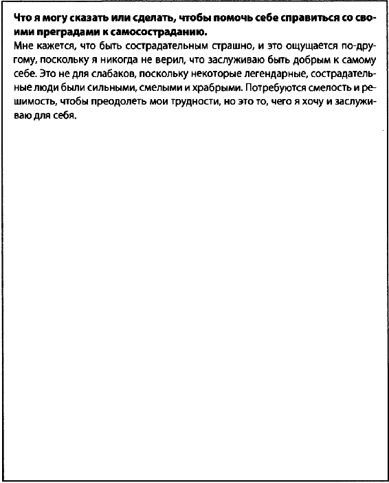 Вы заметили, что в предыдущем упражнении мы использовали частичку "бы" благодаря чему мы можем столкнуться с тем, чего у нас нет, но что мы хотели бы иметь. Если я "бы хотел/хотела", чтобы все было по-другому, то существует высокая вероятность того, что "я бы хотел/хотела" вскоре превратится в "я есть". Необходима сострадательная решимость для работы над такой версией себя, и мы будем прикладывать все усилия в своих попытках, если это именно то, чего мы хотим. Это все, о чем мы можем себя просить. И нам уже известно, что этот путь тяжелый и может быть болезненным, поэтому нам потребуются вся помощь и поддержка, которые мы можем получить от себя и других.