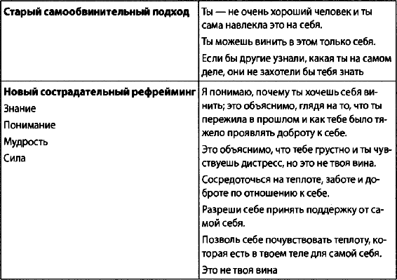 В этой главе мы рассмотрели использование сострадательных писем для изложения своего травматического опыта. Цель этого упражнения — помочь нам создать сострадательный рефрейминг своего чувства самообвинения, благодаря чему можно облегчить чувства страха и стыда, связанные с воспоминаниями.