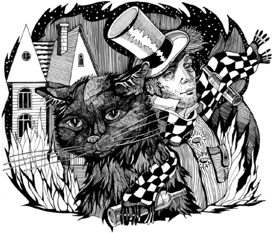 Я вільний від прагнення встановити причинно-наслідкові зв’язки між звірством і нещастям. Я змальовую ланцюжок подій і не хочу залишати невисловленою навіть імовірну ланку. Наступного дня після пожежі я прийшов на згарище. Всі стіни, за винятком однієї, впали. Винятком виявилася внутрішня стіна, не дуже товста, що раніше стояла всередині будинку, я зазвичай спав до неї обличчям. Попри вогонь, тиньк зберігся непогано — на мою думку, так вийшло тому, що її нещодавно поновлювали. Навколо стіни зібрався чималий натовп людей, здавалося, роззяви детально і з непідробною цікавістю оглядають певну частину стіни. Слова «дивно», «незвичайно» та інші подібні вигуки розбудили мою цікавість. Я підійшов і побачив на тлі білої поверхні наче висічену на барельєфі фігуру велетенського кота. Точність зображення була дивовижною. На шиї в нього був мотузок.