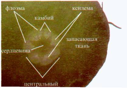 В стеблевой части (А) центральный цилиндр образует многосегментную трубку. Зона гипокотиля (Б) является основой реповидного расширения корня и характеризуется переходным двухсегментным строением центрального цилиндра (б), по расположению проводящих элементов и камбия она близка к стеблевому участку стелы, что позволяет успешно прививать кактусы, делая срез в этой зоне.