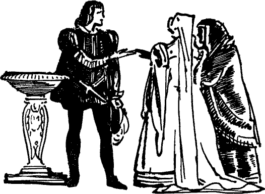Красивый, статный юноша со смуглым лицом, длинными кудрями, большими черными глазами, одетый изысканно, но просто и вооруженный лишь небольшим кинжалом, рукоятка которого пленяла чудесной работой, простоял там не шелохнувшись всю вечерню. Он был, надо полагать, охвачен благочестивым смирением: склонив голову, он с набожным видом шептал что-то — без сомнения, молитвы, ибо произносил слова до того тихо, что лишь господь бог да он сам понимали их смысл.