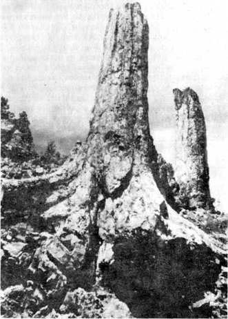 Рис. 76. Окаменевшие деревья найдены на склонах горы в Йеллоустонском национальном парке в вертикальном положении. По–видимому, они были накрыты вулканической массой.