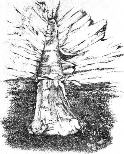 Рис. 77. Окаменевшее дерево, обнаруженное в штате Теннесси. Нижняя часть дерева находится в слое каменного угля, верхняя окружена известняком.