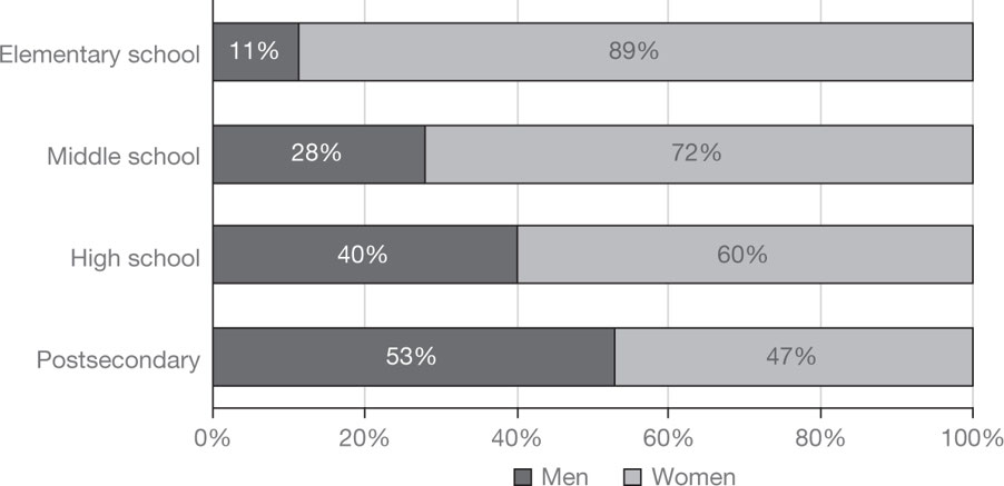 К старшим классам женское лидерство закрепляется. Девочки всегда имели преимущество перед мальчиками по среднему баллу аттестата (GPA), даже полвека назад, когда у них, несомненно, было меньше стимулов, чем у мальчиков, учитывая разницу в показателях посещаемости колледжей и карьерных ожиданий. Однако в последние десятилетия этот разрыв увеличился. Как показано на рисунке 1-1, сейчас девочки составляют две трети старшеклассников, входящих в 10 % лучших по среднему баллу, в то время как в нижней части рейтинга соотношение обратное.