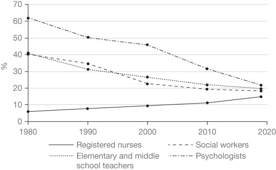 64. В 2008-2009 годах 13 % студентов-медсестер в Орегоне составляли мужчины, в то время как среди дипломированныхмедсестер их было 11 %, и этот рост в лучшем случае соответствовал общероссийским тенденциям. См. Тамара Бертелл и другие, Who Gets In? Pilot Year Data from the Nursing Student Admissions Database (Portland: Oregon Center for Nursing, 2009), таблица 5, стр. 11.