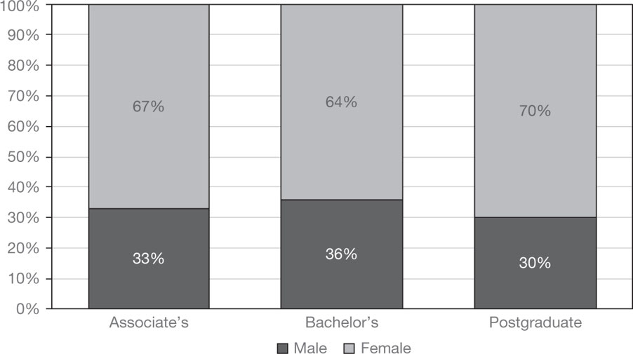 В высшем образовании гендерный разрыв еще больше увеличивается. В США 57 % степеней бакалавра теперь присуждаются женщинам, и не только по стереотипно "женским" предметам: например, на долю женщин приходится почти половина (47 %) степеней бакалавра бизнеса, тогда как в 1970 г. их было менее одной из десяти.³⁷ Женщины также получают большинство степеней юриста, по сравнению с примерно одной из двадцати в 1970 г.³⁸.