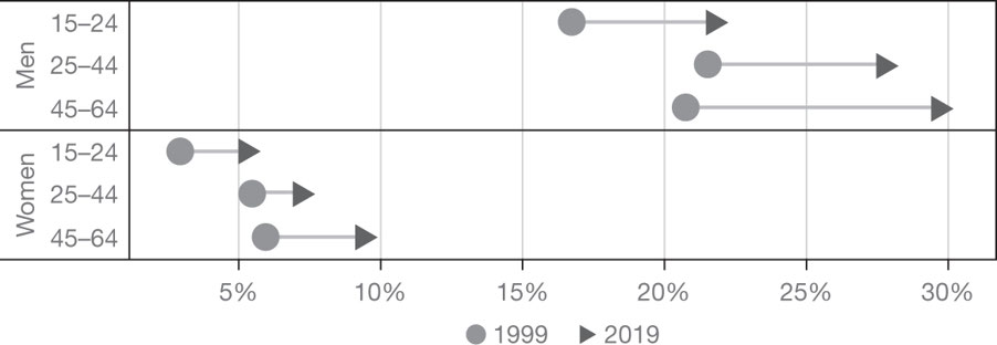 На Рисунке 1-2 показан гендерный разрыв в доле ученых степеней, присуждаемых на уровне младших специалистов, бакалавров и выпускников вузов с 1970 по 2019 год.