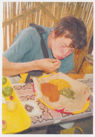 Илья поедает инжеру.