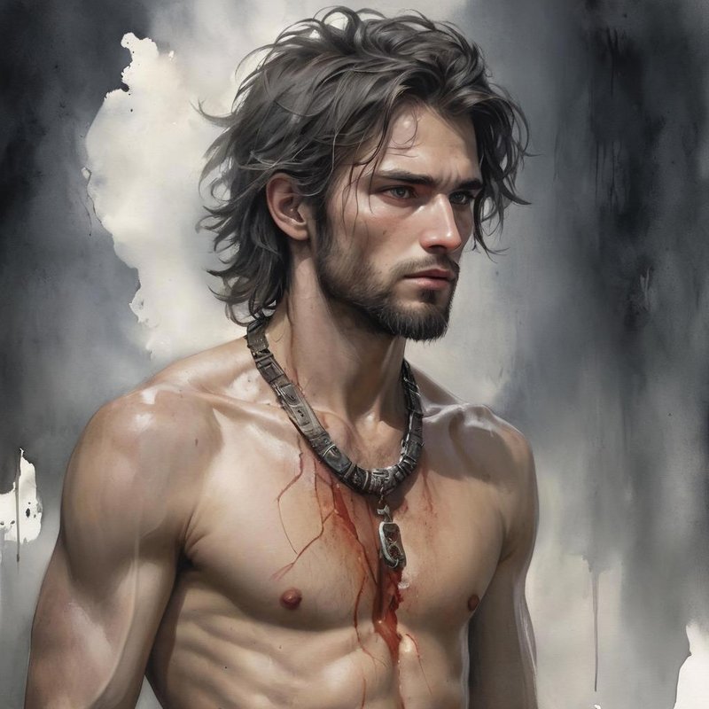 Ягда внимательно посмотрела на него — парень на вид моложе 30, черные растрепанные волосы почти до плеч, борода неопрятная (оно и неудивительно, вряд ли рабам давали бритву), глаза серые, а сам он отощавший, на скелета похож. На теле его скелетообразном живого места не было, весь в увечьях. Его явно пытали, плетью хлестали, да и в бою он был, раны от которого до сих пор не зажили.