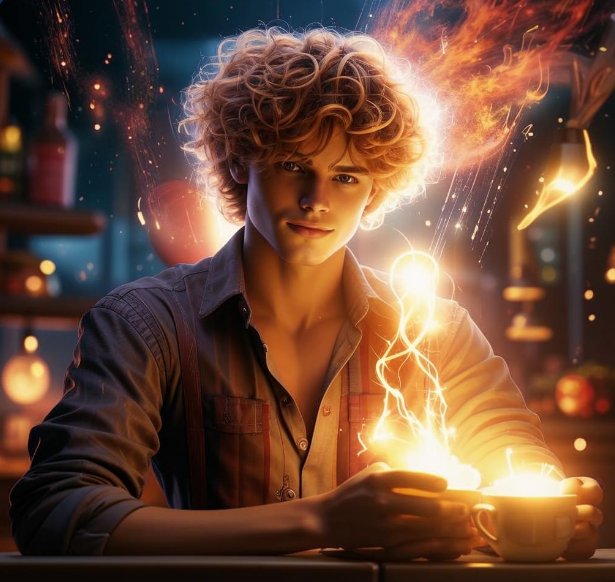 И тут с волосами этого Дриго произошло нечто странное — они сами собой стали подниматься над головой, будто становясь дыбом. Потом кончики потихоньку заискрились, и скоро вся голова баристы вспыхнула, будто на ней развели костёр. И глаза стали переливаться всеми оттенками янтарных цветов, да ещё сиять, как бутылочные стёклышки на солнце.