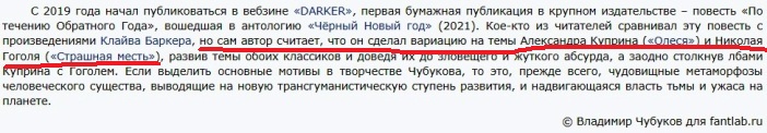 Чубуков имеет привычку графоманить Гоголя, Куприна и Клайва Баркера, чем и хвастается на Фантлабе.