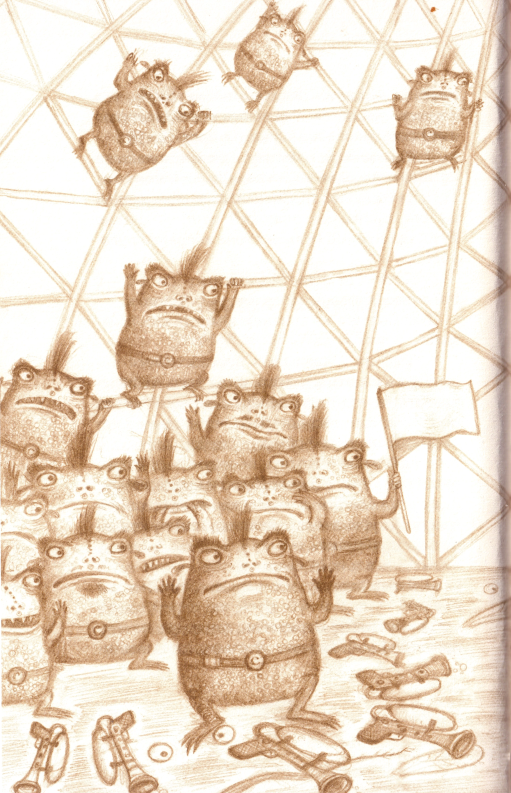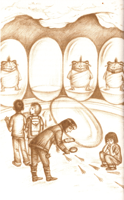 Та раптом чую звук, від якого мороз пробігає по шкірі, - ляскання перетинчастих вологих лап кам’яними східцями, що ведуть нагору. А потім у голові вибухає ціла злива пронизливих звуків: свист, дзижчання, скрегіт і кумкання. Припадаю оком до щілини, що утворилася в моїй схованці, і бачу істоту, схожу на велетенську блакитну жабу з синьою бородавчастою мордою. Потвора принюхується і суне в мій бік. У цю мить з мого горла вириваються огидні звуки: скрегіт, металеве ляскання, дзижчання і пронизливий свист.