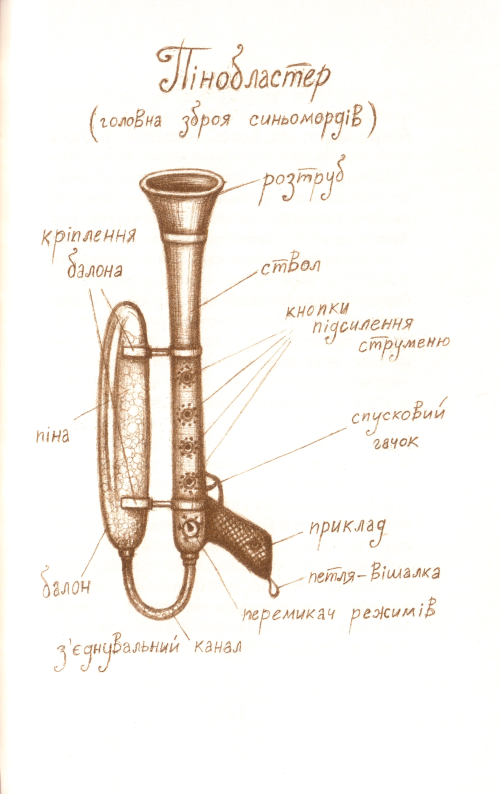 Я підбіг до мами й тата, щоб спробувати звільнити їх, але перечепився об якийсь клунок і шкереберть полетів на кам’яну підлогу. Поки Заєць допомагав мені підвестися, бо сам я цього зробити не міг – ноги заплутались у якійсь в’язкій речовині, бабуся ввімкнула ліхтарик на повну потужність. Нарешті ми могли як слід роздивитися це приміщення і тих, хто в ньому перебував. З’ясувалося, тут, крім моїх батьків, була іще одна істота – синьоморд, який спав, задерши лапи, і об якого я, виявляється, спіткнувся. На підлозі біля блакитного монстра валявся пінобластер.