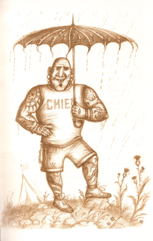 Після цього татуйоване одоробло, прикриваючись великою чорною парасолею, посунуло в бік металевої рейки, привішеної до обідраної з усіх боків старої смереки. За мить над вершечком Підстави почулося голосне бамкання – починався черговий день у таборі «Екстремал». А я, безнадійно махнувши рукою, поплентався до свого мокрого намету № 13, щоб за кілька хвилин приготуватися до якогось збіговиська, про яке говорив Тютя.