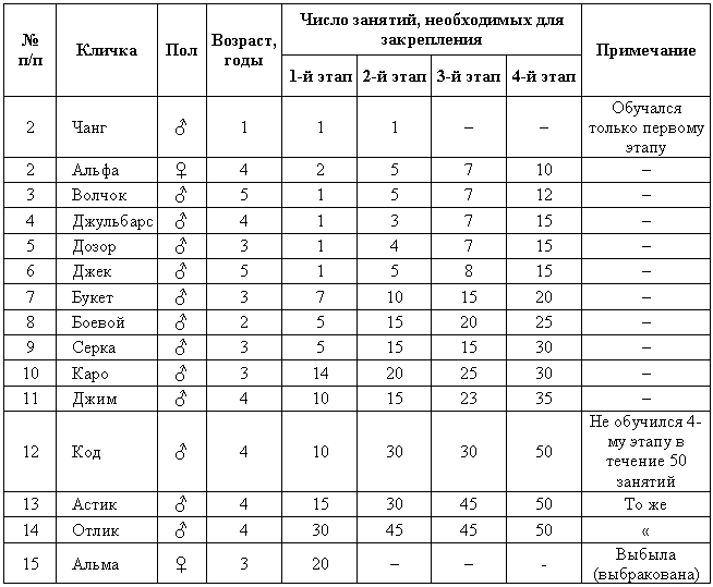 Материалом для этого послужили 300 собак (главным образом немецкие овчарки и эрдельтерьеры, принадлежащие как ведомственным питомникам, так и частным лицам). Так как, согласно нашей рабочей гипотезе, у мало возбудимых собак пассивно-оборонительная реакция может не проявляться, что может очень затруднить картину наследования, нами были взяты наиболее возбудимые породы и пометы, чтобы избежать возможности непроявления пассивно-оборонительной реакции у мало возбудимых собак.