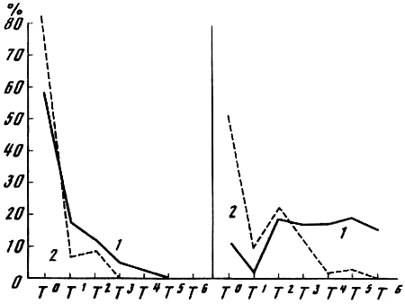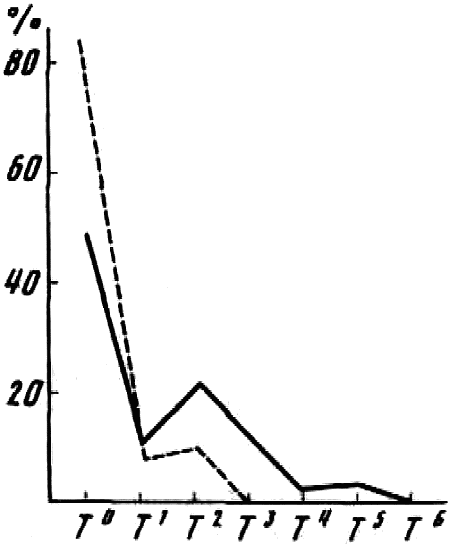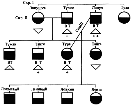 Несколько лет назад я столкнулся с интересным явлением. Речь идет о проявлении резко выраженной пассивно-оборонительной реакции (трусости) у гибридов первого поколения, получившегося от скрещивания гиляцких лаек с немецкими овчарками. Три кобеля гиляцких лаек, привезенные из районов р. Амур, не обладавшие пассивно-оборонительной реакцией (трусостью), скрещивались три последующих года с различными немецкими овчарками, также не обладавшими данной реакцией поведения (имевшими активно-оборонительную реакцию — злобность); они дали потомство в количестве 25 экз. с явно выраженной пассивно-оборонительной реакцией (родословная № 1) (рис. 1). Поведение получившихся гибридов весьма характерно: при подходе незнакомого лица собаки быстро убегали с поджатым хвостом и прижатыми ушами, забивались в темный угол; зрачки у них сильно расширялись, мускулатура титанически напрягалась, наблюдался ясно выраженный тремор, температура тела поднималась, доходя в некоторых случаях до 40°.