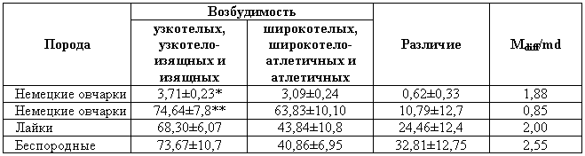 В табл. 1 приведены данные результатов определения возбудимости гиляцких лаек, немецких овчарок и их гибридов.