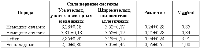 Несмотря на то что по степени силы наблюдается непрерывная изменчивость между исследованными особями, в приведенной таблице все собаки разделены на две альтернативные группы: слабые и сильные.