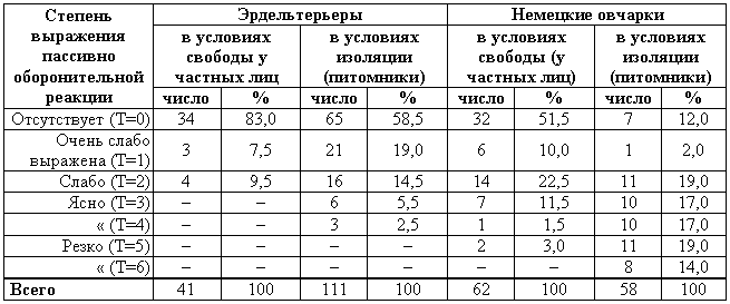 Приведенные данные говорят также о возможности наследования пассивно-оборонительной реакции как доминантного (или неполностью доминантного признака), но все же различные условия содержания собак, отсутствие точной объективной методики учета заставляют делать подобные выводы с большой осторожностью.