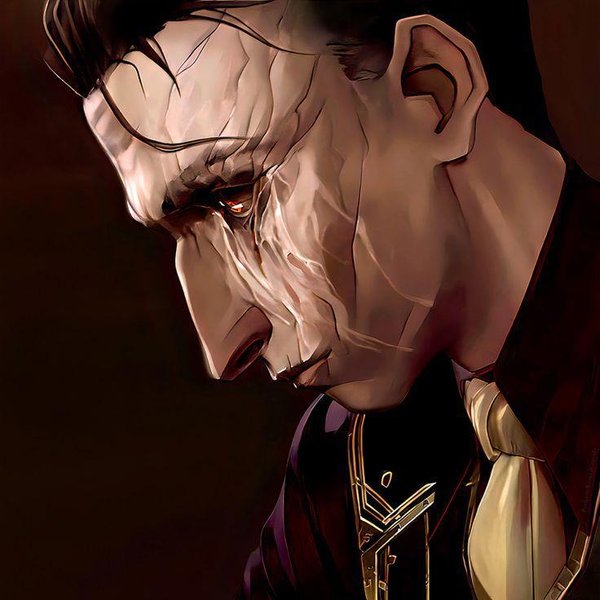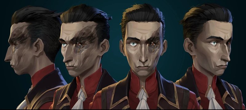 Черные, зачёсанные назад волосы, худое, продолговатое лицо с морщинами от не слишком хорошей жизни, узкий подбородок, длинный нос с горбинкой, тонкие широкие губы и, самое примечательное, широкий уродливый шрам от химического ожога на всю левую часть лица, из-за чего глаз с той стороны (в отличии от лазурного с нормальным белком на здоровой половине) имеет красную радужку и черную склеру.