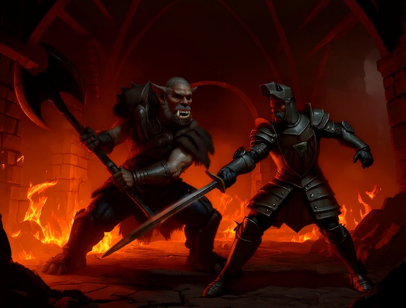Орк, больше удивлённый, чем испуганный, грозно потряс своим топором и издал хриплый боевой клич. Рядом со стрелком стоявший рыцарь, не говоря ни слова, плавно поднял свой арбалет. Его выстрел был точен — орк рухнул за частокол, сражённый в глаз.