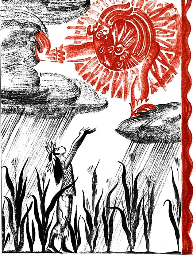 И Тонатиу выполнил просьбу маленькой девочки. Тучи покрыли всё небо, и пошёл дождь. Он шёл много дней. Поля зазеленели, цветы и травы выпрямились, люди были счастливы.