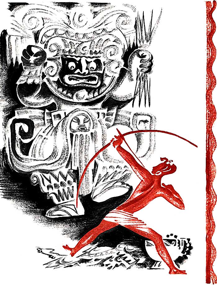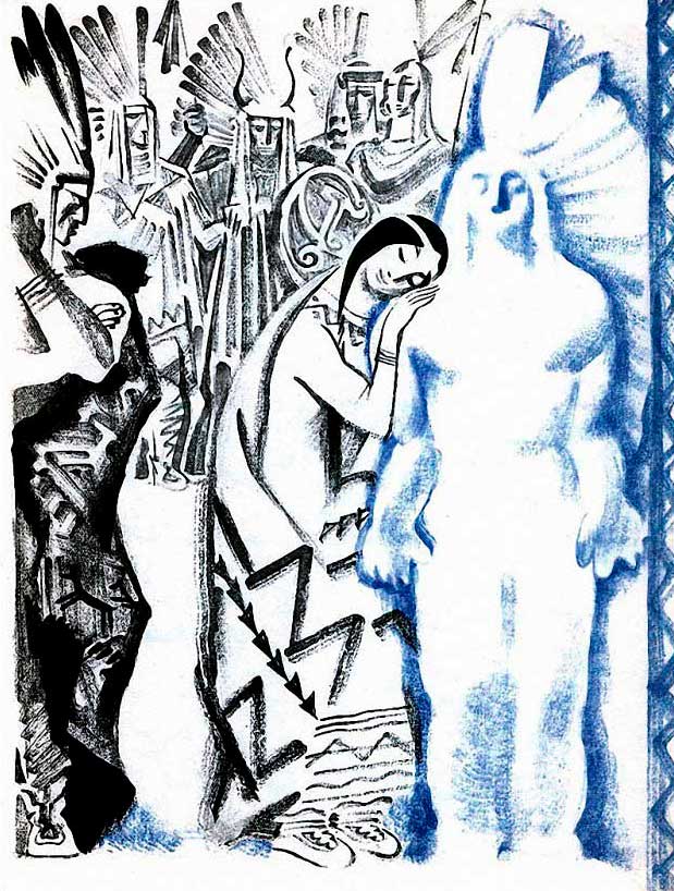Отбросив врагов, Попокатепетль украсил свои шлем орлиными перьями — знаком победы. С торжеством возвращался он к родному племени, мечтая о желанной награде. На улицах города он услышал музыку и победные крики. Но во дворце вождя его встретила тишина. У Покатепетля замерло сердце.