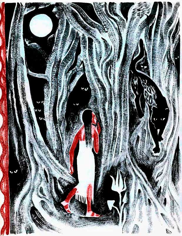 Лес на их пути становился всё гуще и сумрачней, ноги юношей начали вязнуть в болоте. И тогда Лёгкий Мокасин обернулся ястребом, а Быстрый Олень — волком. Звериными тропами пробрались они через такие места, где человеку не пройти.